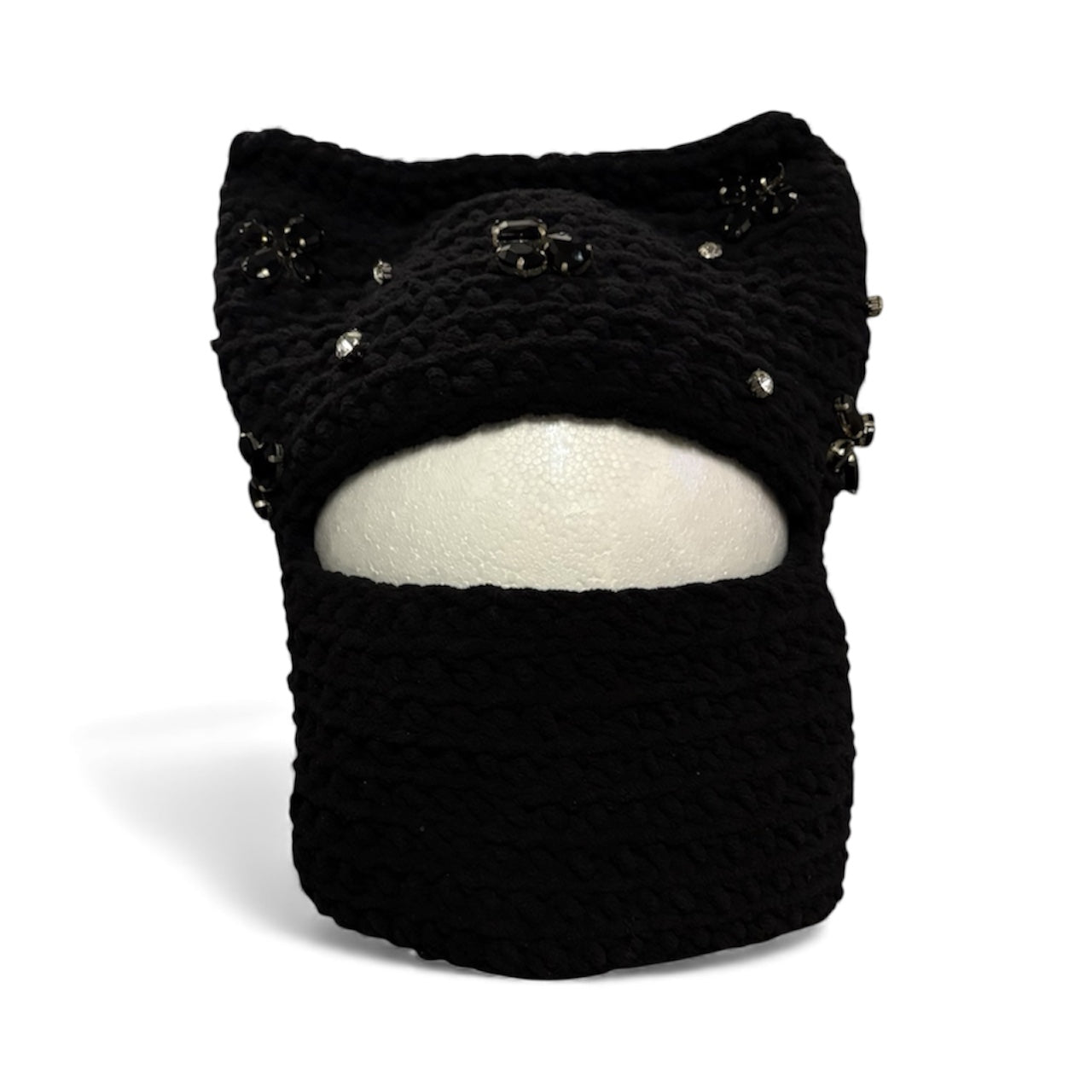 Showcasing hand crocheted balaclavas with creative designs and offering a range of ways to stay cozy in style.